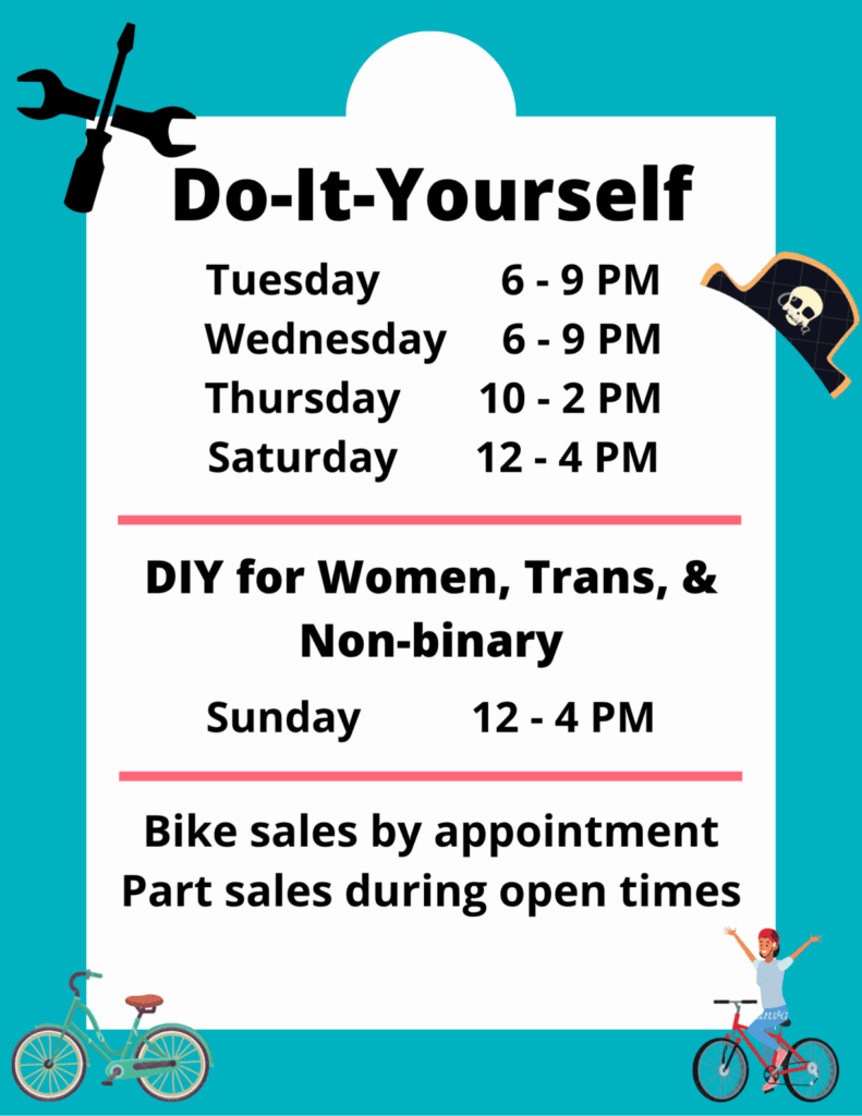 We work with the principle of Do-It-Yourself, but that doesn’t mean we expect you to know how to fix your bike. If you are new to bike repair, our volunteers are happy to teach. You can stop by and learn whatever you want or need to know during any of our regular hours.